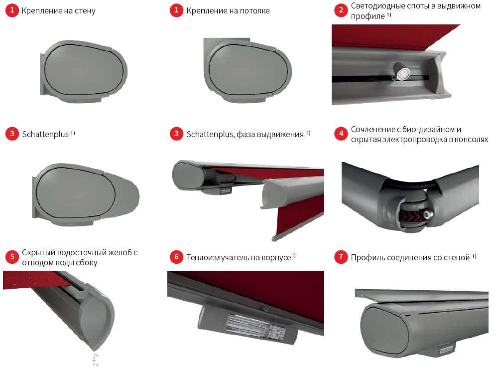 Полотна маркиз, изготовленные из тканей sunvas snc и sunsilk snc, обладают эффектом самоочистки во время дождя (для стока дождевой воды требуется угол наклона маркизы не менее 14°).